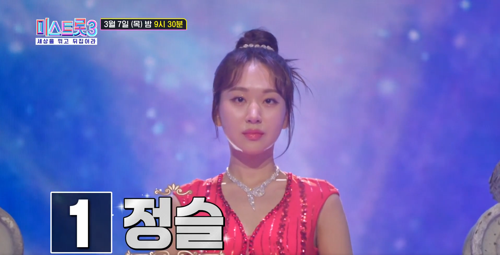 첫번째 무대를 꾸민 정슬은 정수라의 '도라지 꽃'을 불렀는데요, 첫 무대라 많이 긴장했으나 좋은 무대를 만들어 마스터들의 큰 호응을 얻었습니다. 마스터 점수 최고점 99, 최저점 89점을 받았으며, 실시간 문자 투표를 반영하여 최종 1787.61점으로 최종 7위에 올랐습니다.