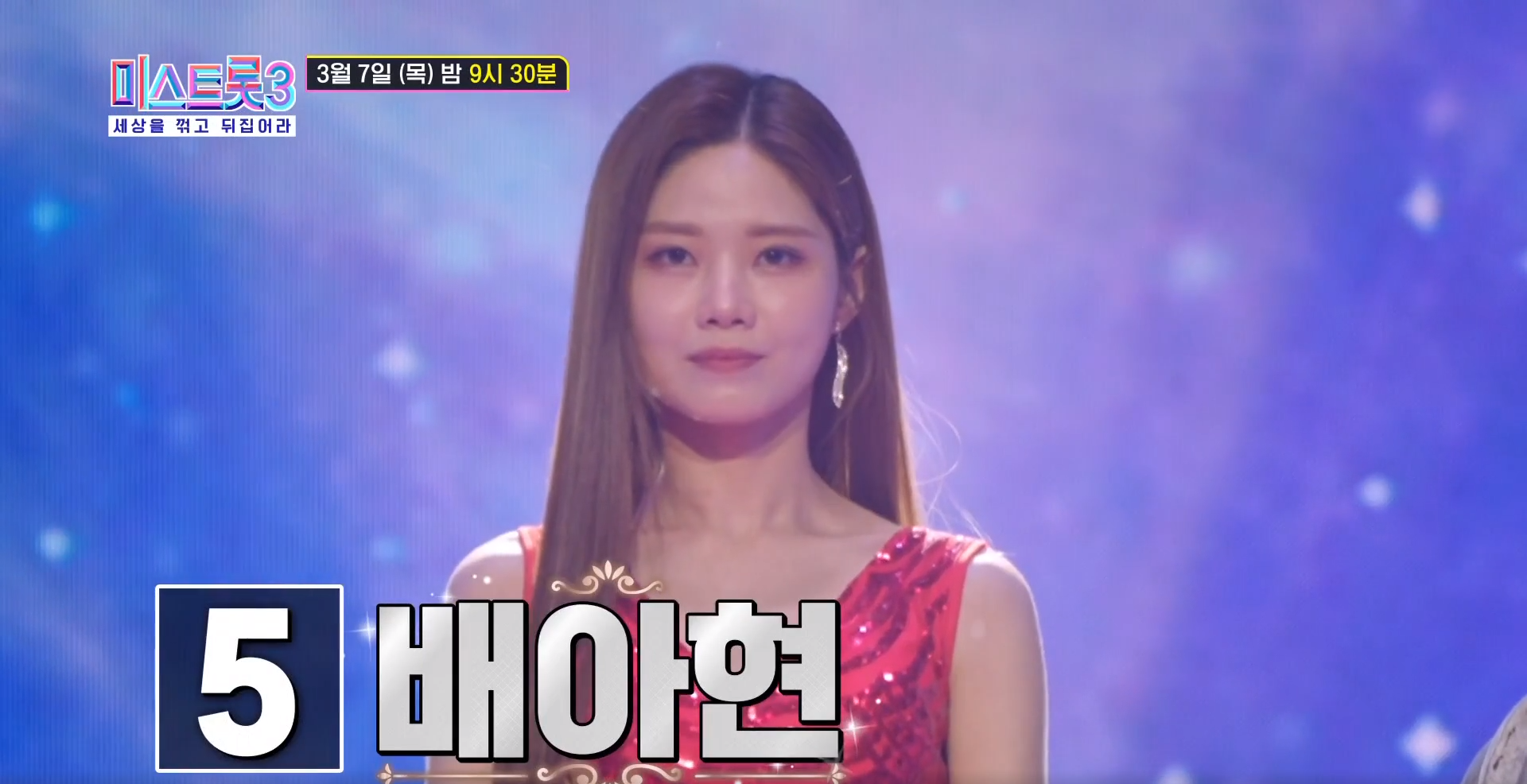 다섯번째로 등장한 배아현은 나훈아의 '평양 아줌마'를 불렀는데요, 팬들 덕분에 힘든 기간에도 포기하지 않고 노래 할 수 있었다며, 팬들의 향한 사랑을 전하는 노래를 불렀습니다. 마스터 점수는 최고 100점, 최저 96점으로 높은 점수를 기록 하였으며, 마지막 접전 끝에 최종 2801.29점으로 2등인 '선'에 올랐습니다.