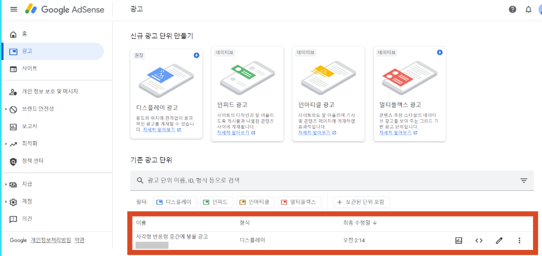 5. 광고를 만든 후 광고단위기준에 들어가 스크롤을 아래로 내리면 만들어진 광고들이 있는것을 확인할 수 있습니다.