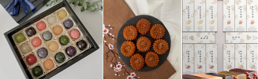 영양떡, 퓨전떡 등, 아주 다양한 종류의 떡들이 선물세트로 나오고 있습니다. 명절을 맞이하여 가족들이 모이는 자리에서 개별로 포장된 떡을 주고받으며 먹을 수도 있고, 아이들이 좋아하는 초코, 바나나, 수박 등의 다양한 맛의 떡들도 맛볼 수 있으니 남녀노소 모두에게 좋은 선물이 될 것입니다.